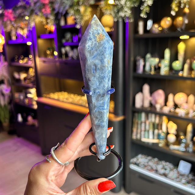 Blue Kyanite and Golden Healer Wand on Stand R54J2